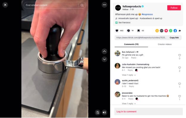 For example, Fellow is a niche brand that targets coffee aficionados who are highly engaged by the process of preparing craft coffee drinks. Its social media strategy doesn’t focus on promotional messaging or product features.