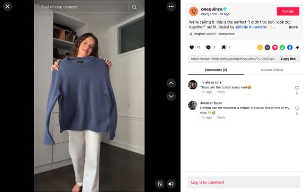 Quince is a brand that expertly implements this tactic. Essentially, it uses influencer collaborations to maximize product awareness. Moreover, it thoughtfully chooses industry voices that have the highest chances of engaging its target audience, ensuring the best possible outcomes across all platforms.
